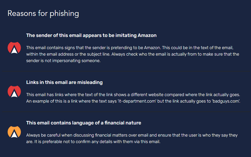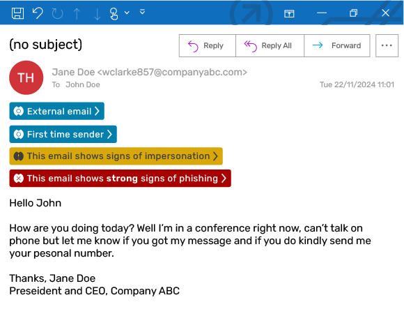 AI wykrywa wiadomości phishingowe. Kontekstowe, kolorowe banery pomagają zmniejszyć ryzyko i zwiększyć świadomość bezpieczeństwa.