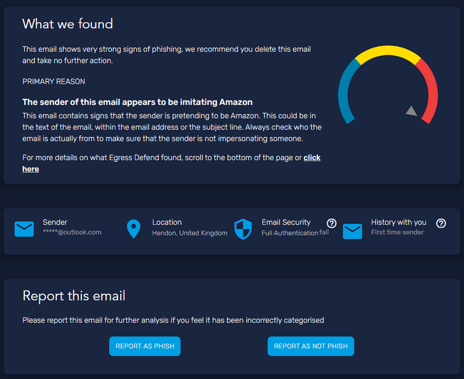 Defend początkowo traktuje każdą wiadomość e-mail jako niewiarygodną, stosując kontrole oparte na zaufaniu dopiero po dokładnej analizie treści. To podejście skutecznie wychwytuje zaawansowane zagrożenia, takie jak naruszenie łańcucha dostaw lub próby podszywania się.