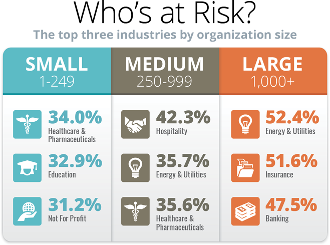 Aby obliczyć procentowy wskaźnik Phish-Prone dla każdej organizacji, zmierzyliśmy liczbę pracowników, którzy kliknęli symulowany link w wiadomości phishingowej lub otworzyli zainfekowany załącznik podczas kampanii testowej, z wykorzystaniem platformy KnowBe4. W tegorocznym badaniu w kategoriach małych, średnich i dużych przedsiębiorstw najbardziej zagrożone branże to opieka zdrowotna i farmaceutyka, hotelarstwo oraz Energetyka i usługi komunalne.