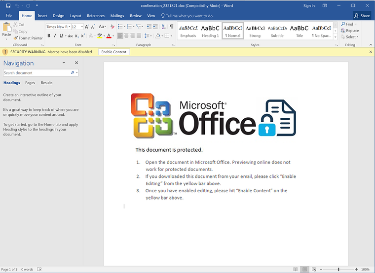 Złośliwe makra w wiadomościach phishingowych stały się w zeszłym roku jednym z częściej używanych sposobów na dostarczanie oprogramowania ransomware. Takie dokumenty zbyt często bez problemu omijają programy antywirusowe. Wiadomości phishingowe mają wywoływać u odbiorcy konieczność szybkiej reakcji, a jak widać na poniższym zrzucie ekranu, dokumenty prowadzą użytkownika przez cały proces. Jeśli użytkownik nie włączy makr, atak się nie powiedzie.