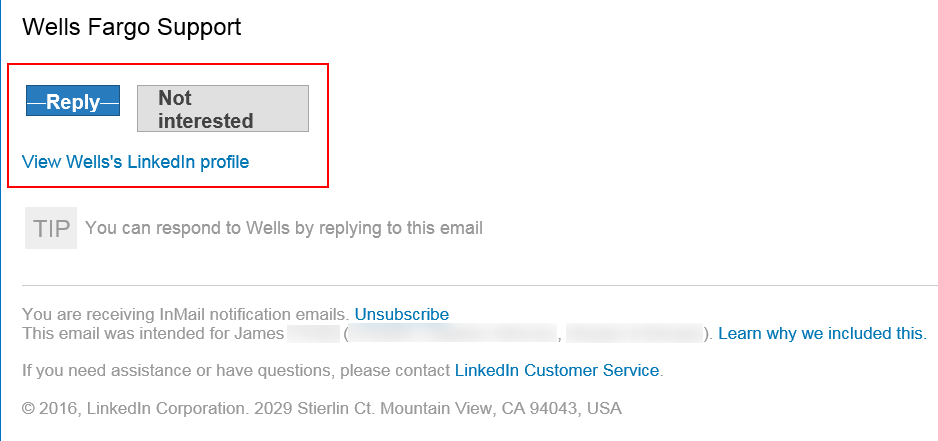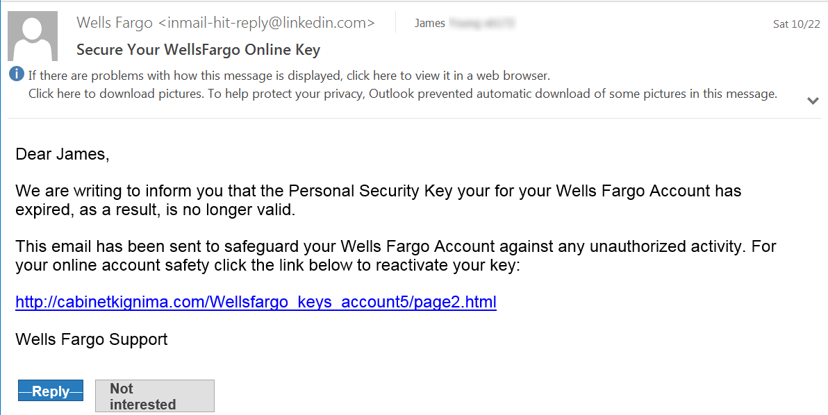 W jednym z ataków użytkownik zgłosił, że otrzymał standardowy phishing dotyczący danych uwierzytelniających Wells Fargo, za pośrednictwem poczty wewnętrznej serwisu LinkedIn: